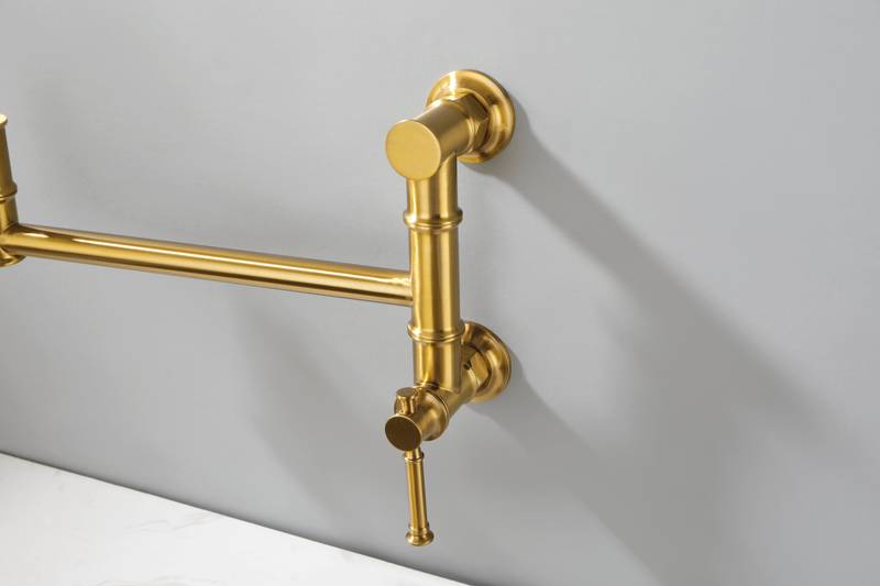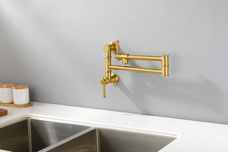 - Discover the perfect blend of style and functionality with our Gold Brass Pot Filler Faucet. Designed with a free-swivel arm, this faucet makes filling pots on the stovetop effortless and simplifies cleaning. The double handles ensure precise water control, preventing drips and making operation a breeze. Its specially treated surface resists corrosion and fingerprints, maintaining its elegant look. Enjoy a quiet, splash-free flow with the high-quality aerator. With dimensions of 22 inches in length, 6.8 inches in width, and 2.3 inches in height, and weighing just 4.2 pounds, this faucet is an ideal addition to any kitchen. Upgrade your culinary experience today!