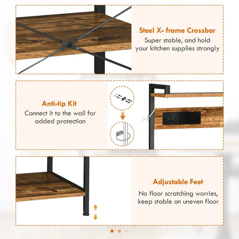 - Stay powered up with two built-in outlets and USB chargers, perfect for your air fryer or microwave. Enjoy organized cooking with adjustable shelves, a pull-out basket, and five hooks for your kitchen gadgets.