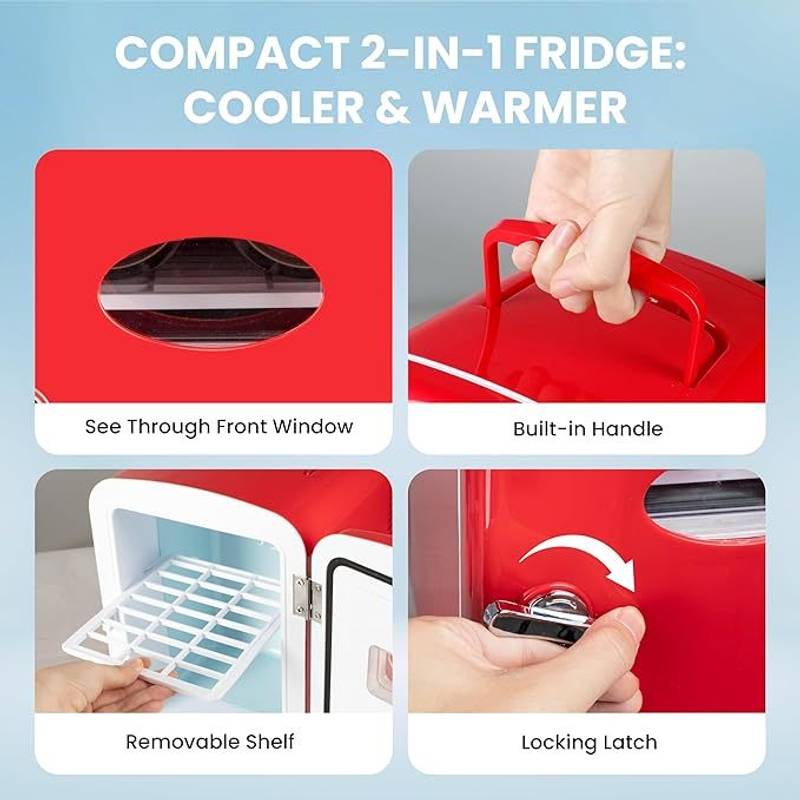 - Introducing our vibrant red mini fridge, perfect for space-saving and versatility! With a 4-liter capacity, it holds up to six 12 oz cans and easily fits on bookshelves or desks. Enjoy year-round convenience with a simple switch to cool your drinks (59-64.4°F) or warm your snacks (122-149°F). Choose between home or car power options, making it ideal for both indoor and on-the-go use—just remember to keep the car running to avoid battery drain. Plus, it's eco-friendly with 100% Freon-free technology, ensuring quiet operation and energy efficiency. This stylish mini fridge is not just practical but also makes a great gift, adding a pop of color while keeping your beverages or cosmetics perfectly stored.