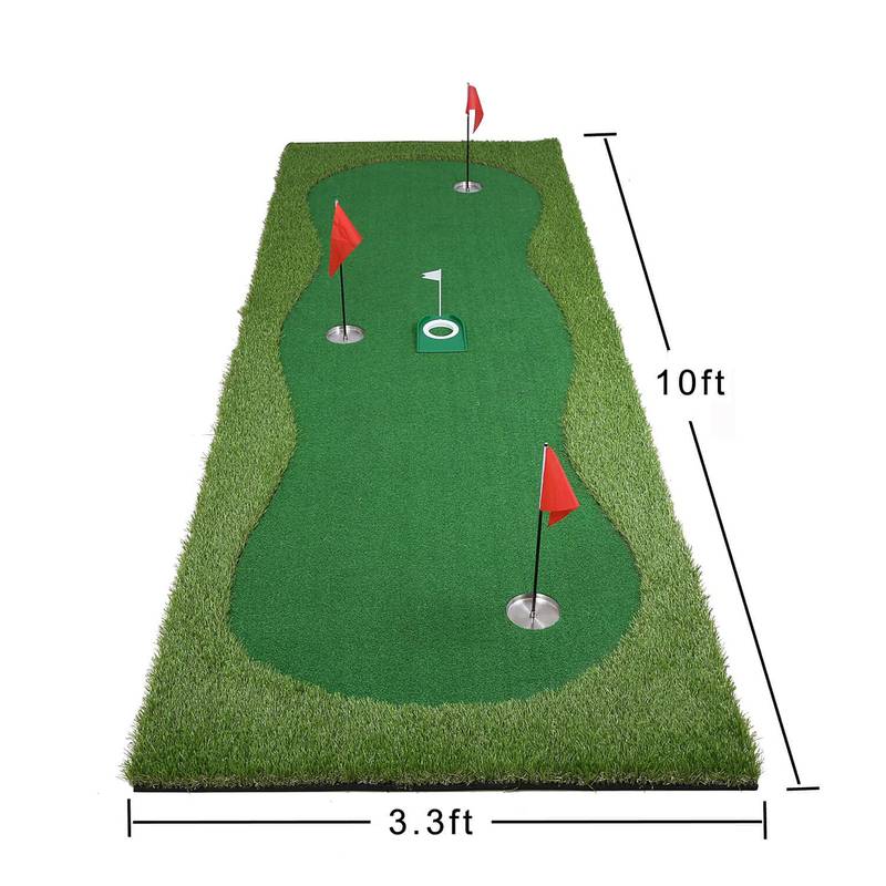 - Perfect for both indoor and outdoor use, it features a challenging layout with three cups and undulations, allowing you to refine your skills in various scenarios. Sized at 10 feet long and 3.3 feet wide, it offers plenty of room for practicing different putts and distances.